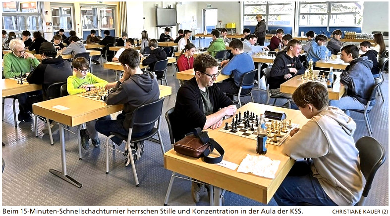 Doch jetzt trägt die KSS bis 2029 erst einmal das Qualitätssiegel „Deutsche Schachschule“ in Silber, was die Plakette gleich am Haupteingang zeigen werde, wo sie „gebührend präsentiert“ werde, so Simon Claus. Nach dem Festakt stärkten sich die rund 50 Teilnehmenden des schuleigenen Schachturniers – wenige Schülerinnen, zahlreiche Schüler sowie zwei Lehrer – mit Pizza und Muffins, um sich dann an den 24 Tischen zum 15-Minuten-Schnellschachturnier einzufinden. Die Zahl der Schach spielen den jungen Leute wachse, sagt Finn Petersen von der Deutschen Schachjugend. Dem Verband gehören über Vereine mehr als 30000 Kinder und Jugendliche an. Dazu beigetragen habe das Online-Schach während der Corona-Pandemie, aber auch die Erfolge des 21-jährigen Vincent Keymer, dem bisher jüngsten deutschen Schachgroßmeister und derzeit Fünften der Weltrangliste, und des 29-jährigen Matthias Blübaum, Europameister und qualifiziert für das Kandidatenturnier zur diesjährigen Schachweltmeisterschaft. Die beiden seien eine schöne Werbung für den Sport und Vorbilder für den Nachwuchs – wie auch engagierte Lehrkräfte wie Simon Claus.