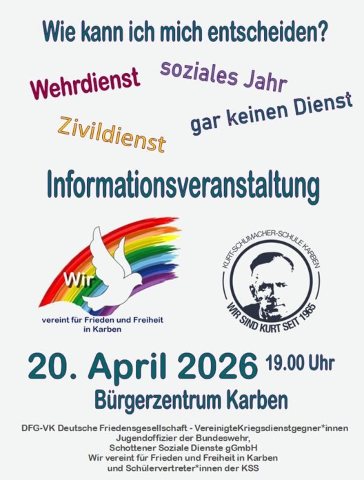 Wie können wir in Europa und damit in unserem Land den Frieden sichern? Diese Frage ist in den letzten Monaten und Jahren zu einer der zentralen Frage in unserem Land geworden. Eine Antwort darauf ist die Neuorganisation der Bundeswehr. Ein erster Schritt dazu ist die Erfassung junger Menschen, die in diesem Jahr ihre Volljährigkeit erreichen. Dazu verschickt die Bundeswehr etwa 700 000 Briefe. Ziel ist es, so mehr Freiwillige für den Wehrdienst zu mobilisieren. Junge Männer sind verpflichtet auf das Anschreiben zu antworten. Frauen können das freiwillig tun. Mit dieser Anfrage der Bundeswehr ergibt sich für junge Menschen, die in der Regel in Ausbildung sind oder Schulen besuchen eine neue Situation und eine Reihe von Fragen. In Gesprächen der Karbener Initiative "Wir vereint für Frieden und Freiheit in Karben" mit Schülerinnen und Schüler wurden beispielsweise folgende Fragen formuliert: